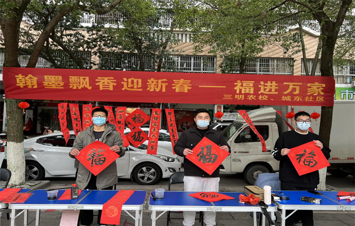 2022年新春临近。为营造祥和、喜庆的节日气氛,1月21日上午,米兰(中国)一站式服务平台孙启煌老师带领2019级电气自动化五年专班学生王怀畅、杨浩镇,到沙县城东社区现场挥毫,免费为社区居民写春联、送“福”字。