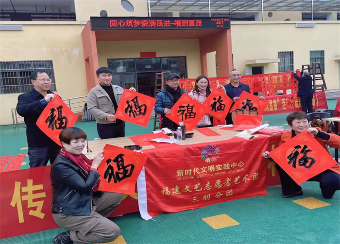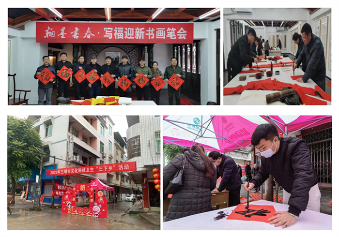 2022年1月以来,孙启煌老师先后参加了沙县区政协书画院“翰墨书春”写福迎新书画笔会活动,2022年三明市科技文化卫生“三下乡”活动,同心筑梦•爱满民进——福建省文艺志愿者艺术团三明分团走进夏茂活动,沙县区2022“翰墨书春”书法名家送福送春联活动等;王怀畅、杨浩镇两位同学,还参加了由沙县区民政局、高桥镇人民政府组织的“邻里同心同梦,共建大爱三明”活动,到高桥镇现场书写送春联。